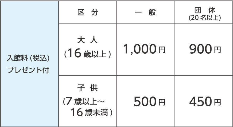 入館料金 (料金は税込み表示、入館記念プレゼント付き)